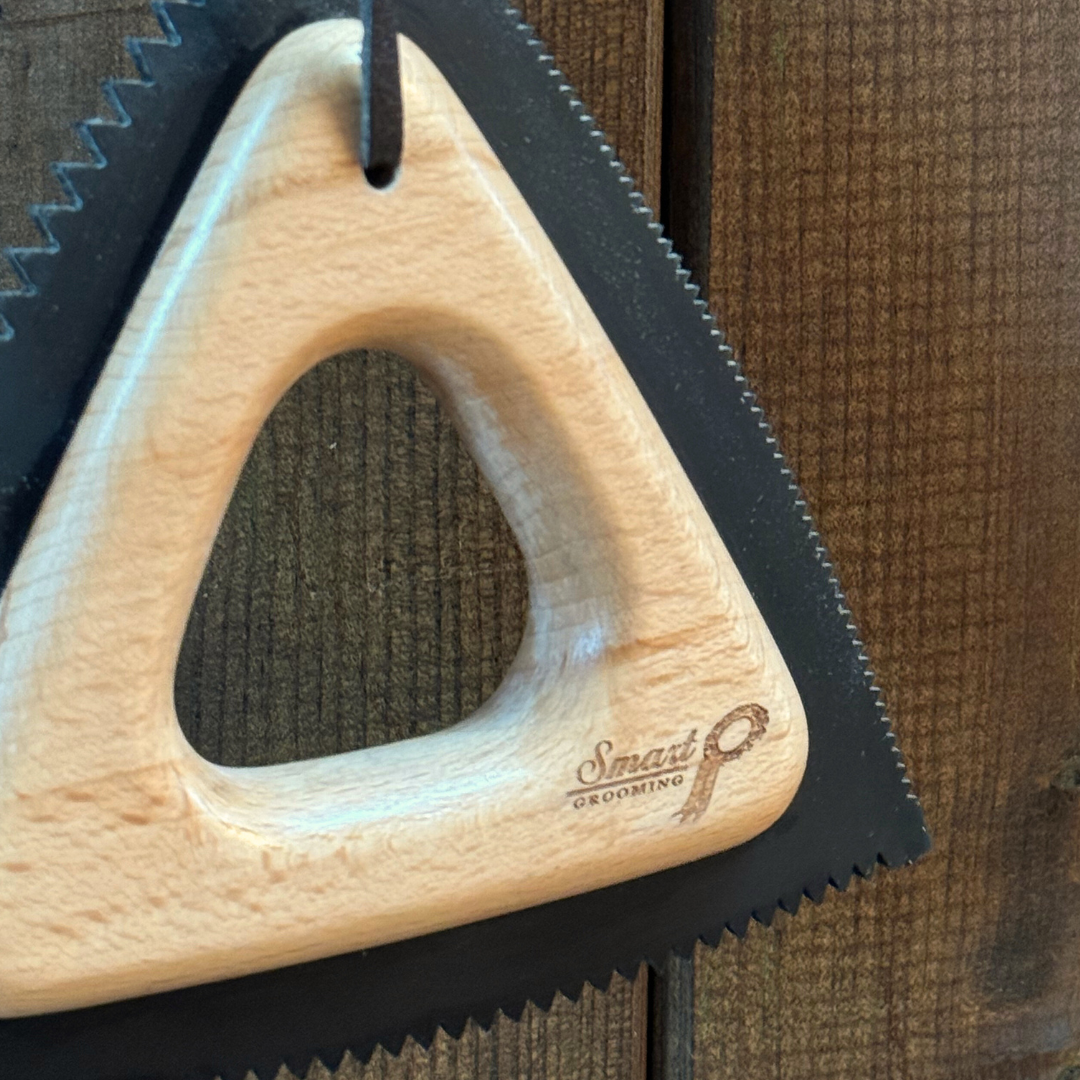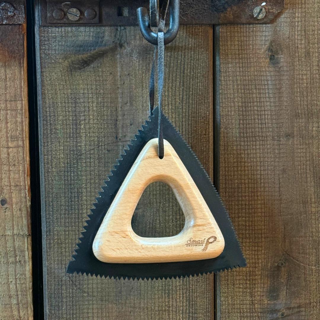 Featuring a solid wooden triangular handle and three sides of flexible rubber teeth, this multi-purpose tool fits comfortably in your hand, making grooming effortless and enjoyable for even the most sensitive of skins. There are three grades of rubber edged serrations on each side of the Flexi Groom -  fine, medium and coarse, designed to effortlessly comb away loose hair and debris while providing a gentle massaging action that promotes a healthy, glossy shine.